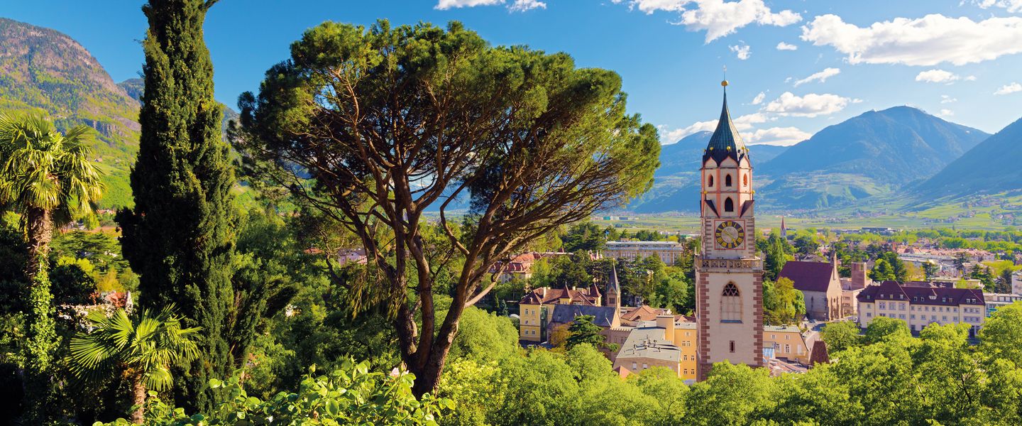 Meran ist eine malerische Stadt in Italien, die sich in der Region Trentino-Südtirol befindet. Sie liegt im oberen Etschtal, umgeben von beeindruckenden Bergen und ist bekannt für ihr mildes Klima, das es zu einem beliebten Kurort macht. Meran ist berühmt für seine Thermalquellen und die wunderschönen Gärten von Schloss Trauttmansdorff, die eine Vielzahl von Pflanzen aus verschiedenen Klimazonen beherbergen. Die Stadt hat eine reiche Geschichte, die bis in die römische Zeit zurückreicht, und war im 19. Jahrhundert ein beliebter Rückzugsort für die europäische Aristokratie. Heute zieht Meran Touristen an, die die Kombination aus Natur, Kultur und Wellness genießen möchten.