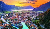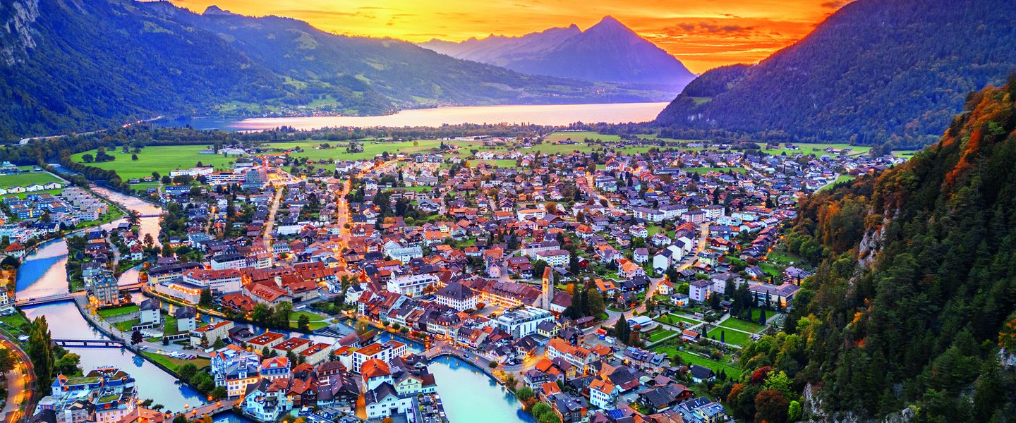 Interlaken ist eine malerische Stadt in der Schweiz, die im Kanton Bern liegt. Sie befindet sich zwischen dem Thunersee und dem Brienzersee und ist von beeindruckenden Bergen umgeben, darunter die berühmten Gipfel Eiger, Mönch und Jungfrau. Interlaken ist bekannt als eines der wichtigsten Touristenzentren der Schweiz und zieht jedes Jahr Millionen von Besuchern an, die die atemberaubende Natur, die zahlreichen Outdoor-Aktivitäten und die charmante Atmosphäre der Stadt genießen möchten. Die Stadt hat eine lange Geschichte, die bis ins 12. Jahrhundert zurückreicht, und entwickelte sich im 19. Jahrhundert zu einem beliebten Ziel für Reisende, die die Alpen erkunden wollten.